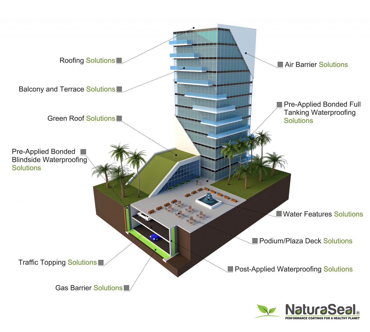 NaturaSeal is a leading international manufacturer that specialises in producing environmentally sustainable building envelope solutions that are 100% free of volatile organic compounds (VOCs), and is odourless and water-based. Its applications include but are not limited to waterproofing, air barrier, roofing, corrosion control, radon gas, dust and deep soil stabilisation, fireproofing and soundproofing.